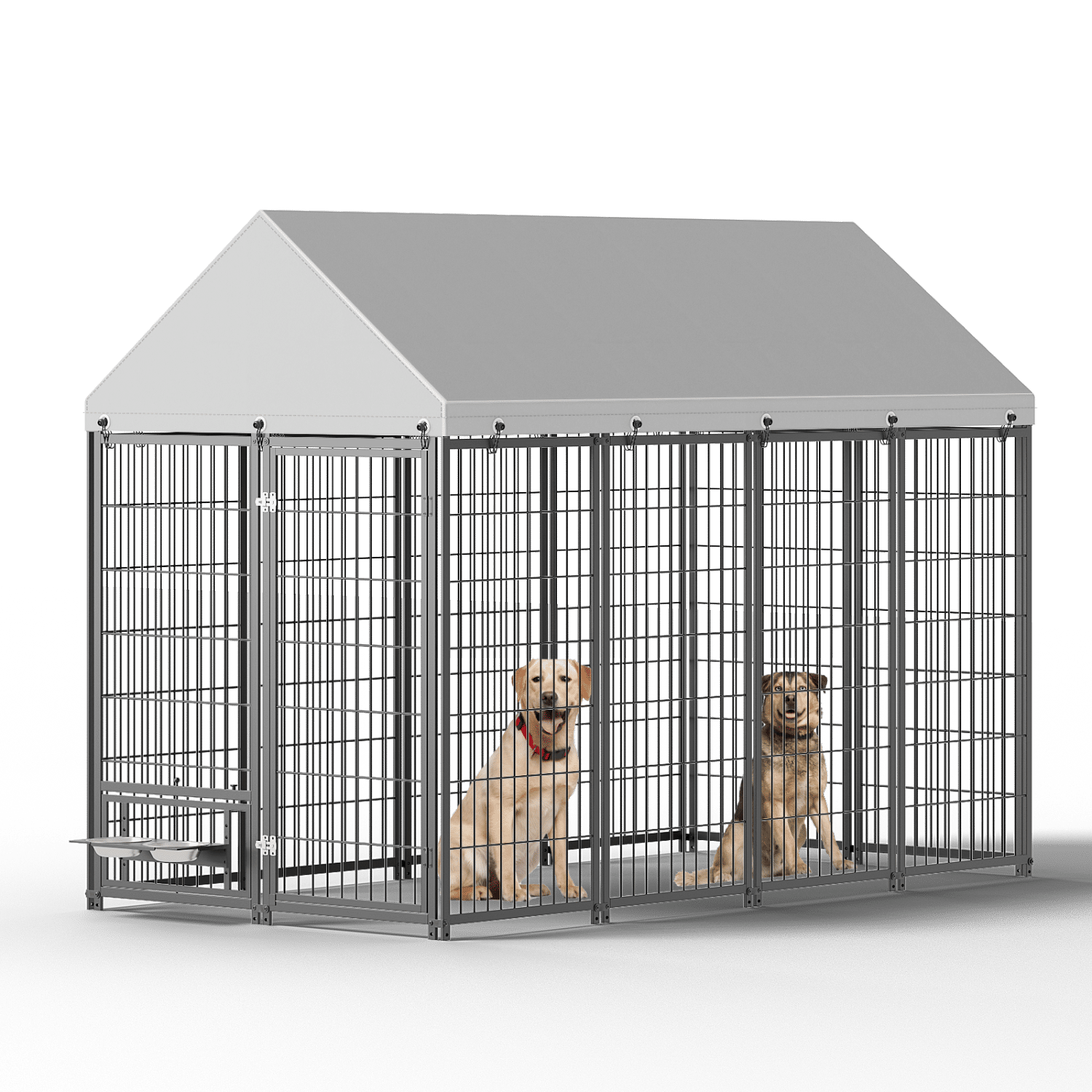 Reinforced structure: This outdoor dog cage is made of high-quality metal iron, with multiple load-bearing columns added for greater stability. The double door lock design prevents your pet from rushing out of the cage.