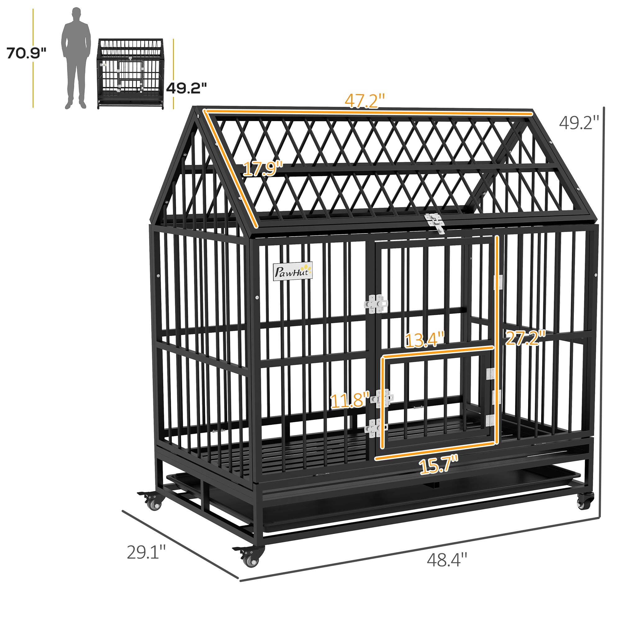 • - Interior Cage Dimensions: 47.2" L x 27.6" W x 42.1" H / 29.5" H (To Roof/Eave)